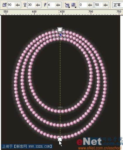 4、用椭圆工具画一个椭圆作为新路径。用交互式调和工具选中珍珠,在属性栏上点“新路径”,鼠标会变成弯曲的箭头状。