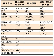 强还原性物质或离子:Fe2+、FeO、Fe3O4、Fe(OH)2、FeS、FeS2、FeBr2、FeI2、CuS、Cu2S、Cu2O、CuH、SO2、H2SO3、Na2SO3、NaHSO3、H2S、Na2S、NaHS、Na2S2O3、NaI