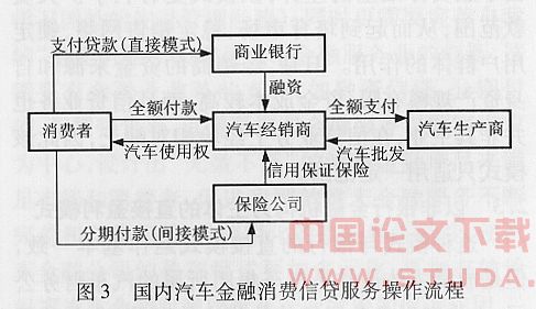 在我国,汽车金融服务的主要内容是汽车消费信贷业务,该业务的主体主要涉及银行、汽车经销商、汽车集团财务公司以及其他非银行金融机构。按照各主体在信贷业务过程中所承担职责及与消费者关联度的不同,目前国内汽车消费信贷盈利运作模式可以分为3种:以银行为主体的直接模式,以销售商为主体的间接模式和以非银行金融机构为主体的直接模式,一般性的业务操作流程如图3。