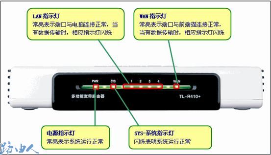 2、检查指示灯,路由器运行正常情况下,电源指示灯(PWR)常亮,系统指示灯(SYS)闪烁,WAN端口以及LAN端口常亮或者闪烁。