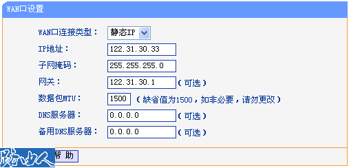 一般上网方式分动态IP地址和静态IP地址,如果您向网络服务商(电信或网通)申请的宽带是固定IP地址,并且网络服务商提供您所有的外网的IP地址信息:包含IP地址(IP Address)、子网掩码(Subnet Mask)、网关(Gateway)、以及DNS服务器地址,也就是上网方式是静态IP。那么您按照如下方式设置您的路由器: