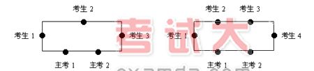 CET-SET 考试采用面对面的形式,每场考试由 2 名主考和 3 (或 4 )名考生组成(如下图):