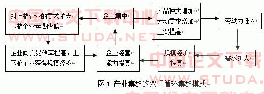 新经济地理学在不完全竞争和规模报酬递增的前提下,用规范的数学模型分析了企业规模经济、市场外部经济、交易运输成本、工资等相互作用过程所决定的制造业的集群动态过程。马歇尔之后,产业集群理论研究在主流经济学中沉寂了相当长的一段时间,只有经济地理学仍然在关注产业的区域集聚问题。20世纪90年代以克鲁格曼为代表的新经济地理学(New Economic Geography)理论为产业集聚的产生提供了很好的解释。克鲁格曼(1991)认为:空间问题没有引起主流经济学家的真正重视是因为缺少精确模式分析报酬递增的假设,他把空间思想引入正式的经济分析,是继马歇尔之后第一位开始把区位问题和规模经济、竞争、均衡这些经济学研究的问题结合在一起的主流经济学家,并对产业集群给予了高度的关注。他认为,经济活动的聚集与规模经济有紧密联系,能够导致收益递增。克鲁格曼从理论上证明了工业活动倾向于空间集聚的一般趋势,并阐明由于处在环境的限制,如贸易保护、地理分割等原因,产业集聚的空间格局可以是多样的,特殊的历史事件将会在产业区形成过程中产生巨大的影响力。克鲁格曼以规模报酬递增、不完全竞争的市场结构为假设前提,在D-S模型基础上加入劳动力流动与要素报酬之间的累积因果关系—— 即劳动力越集中的地方由于垄断竞争的特性,其要素报酬也越高,从而越吸引劳动力的集中——如此便可以解释产业集群的形成。克鲁格曼在D-S模型的基础上从经济活动的内部机制来解释经济活动的集群现象,强调产业“中心”的内生性和竞争均衡的思想,认为产业集聚是由企业的规模报酬递增、运输成本和生产要素移动通过市场传导的相互作用而产生的。