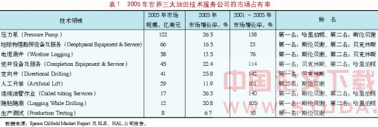 2001年以来,油田技术服务市场增长较快,其中压力泵、连续油管作业、随钻随测等在2001-2005年市场平均增长率达到25%以上;定向井、人工升举、电缆测井等技术服务市场的平均增长率也达到21%左右;地球物理勘探服务的平均增长率为15%。在激烈的市场竞争中,斯伦贝谢、贝克休斯、哈里伯顿“三巨头”的规模不断扩大,市场占有率不断提高(见表1)。