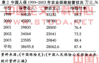 从表2资料可以看出我国农业保险净赔付率非常高,平均高达87.4%,再加上经营成本,保险公司基本是在亏损经营,由此,农业保险经营主体逐渐减少,农业保险的有效供给不足。目前,国内开办农业保险并有一定规模的,只有人民保险公司、中华联合和2004年3月成立的上海安信农业保险公司,其他股份制保险公司基本未予涉及。