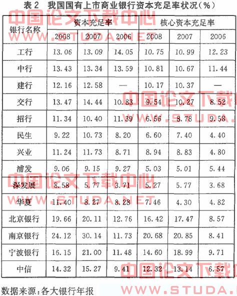 资本充足率是保证银行安全,稳健经营的重要制度。它规定了商业银行资产规模扩张的限度。资本充足率指标现已作为衡量单个银行甚至整个银行体系稳健经营的重要指标,从整体来看,我国上市商业银行的资本金充足率水平均有了很大幅度的提高(如表2所示),