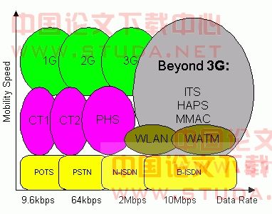 蜂窝移动无线通信系统是当前移动通信的主力军,它采用蜂窝结构,频率可重复利用,实现了大区域覆盖;并支持漫游和越区切换,实现了高速移动环境下的不间断通信。从70年代起,它已经历了第一代(1G)、第二代(2G)并开始进入第三代(3G),未来向超(Beyond)3G过渡。图3描述了移动无线接入和蜂窝移动无线通信系统的发展过程,它们的数据传输速率分别对应于不同的固定通信系统,其中MMAC、HAPS和ITS将在后面介绍。