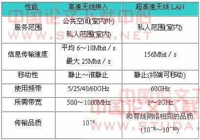 MMAC是由日本推出的多媒体无线接入系统,其目标是通过便携式可视电话和因特网获得信息。如表4所示,目前主要提供两类高速无线接入。第一类用于室内外宽带移动通信系统,用3-60GHz频段传输30Mbps的数据,该项目从2001年开始;第二类提供超高速WLAN室内接入,传输速率达到 600Mbps,采用60GHz频率,即毫米波。但是这些系统不能提供大范围覆盖,也不能用于车辆业务环境,只能用于“热点地区”。研制出的毫米波样机可以演示60GHz的WLAN与ATM或100BASE以太网接口,其数据速率可以达到155Mbps。