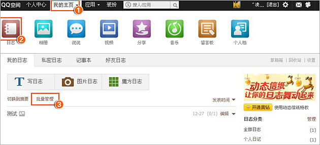 怎么样在QQ空间日志里插入动感影集? 第一步:请登录您的QQ空间,选择导航条我的主页,点击日志,进入到...