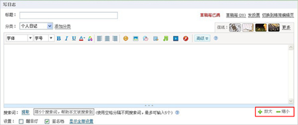 登录QQ空间日志,在日志编辑状态下可以通过点击“放大”“缩小”来改变尺寸。如下图: